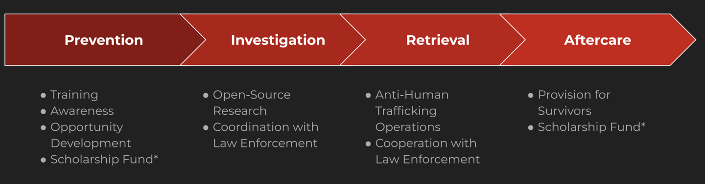 Never Evanescent combats human trafficking in four (4) categories: Prevention, Investigation, Retrieval, and Aftercare. We take this holistic approach for several reasons.